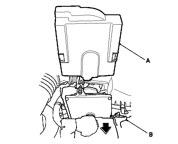 13. Remove the battery setting plate (B), and reposition the battery away from the ECM/PCM.