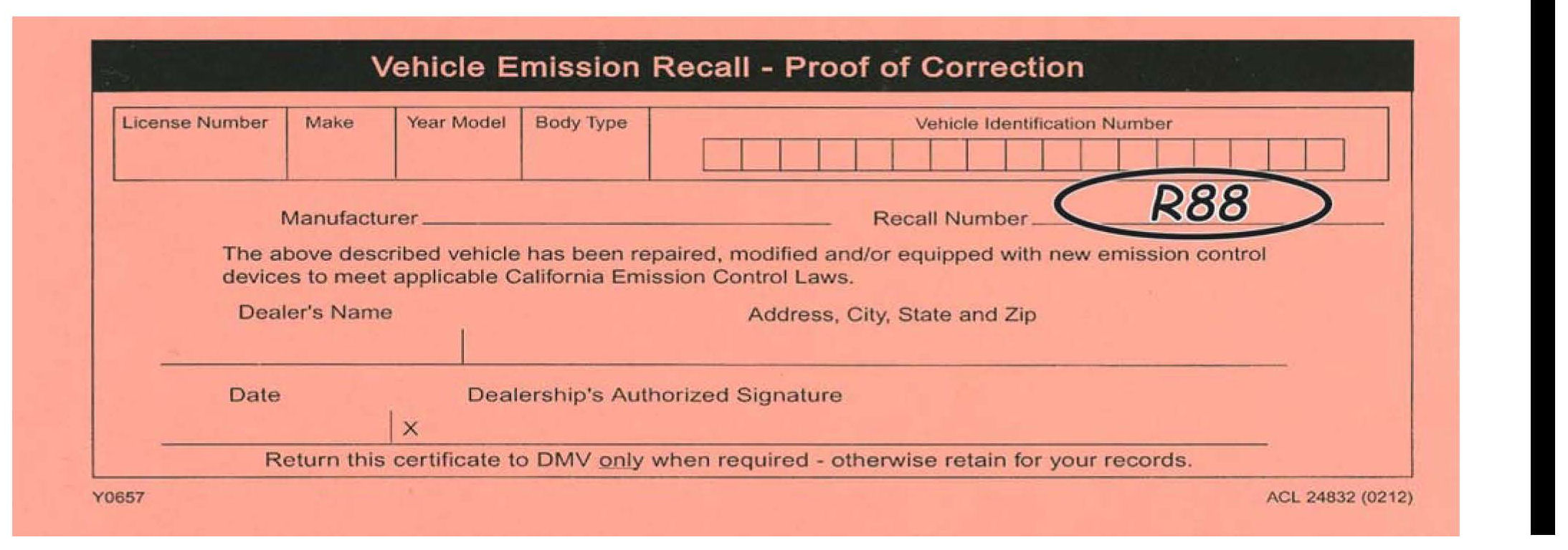 3. For California Residents Only: Fill out a Vehicle Emissions Recall - Proof of Correction certificate, and use R88 as the campaign number. Give the certificate to your client, and advise him or her to keep it as proof that the product update was completed. Your client will need to submit the certificate to the DMV only if the DMV requests it.