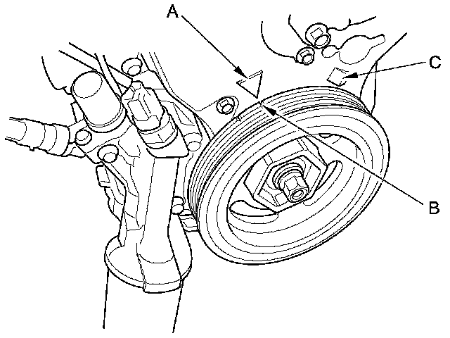 9. Aim the light toward the pointer (A) on the timing belt lower cover. Check the ignition timing under a no load condition (headlights, blower fan, rear window defogger, and air conditioner are turned off).