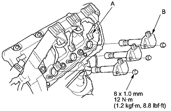 2. Disconnect the ignition coil connectors (A), then remove the ignition coils (B).