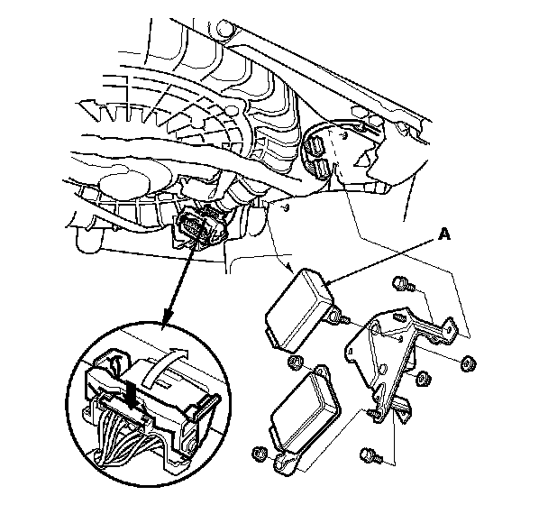 3. Remove the bolts from the bracket that holds the HandsFreeLink control unit, the throttle actuator control module, and the ACC unit (A).