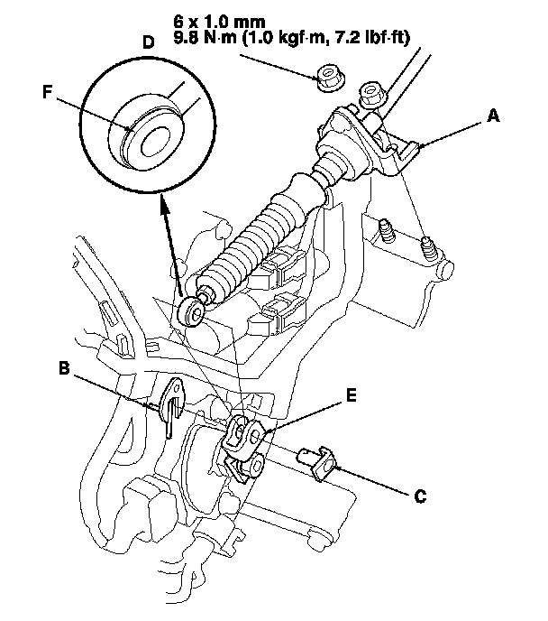 6. Check the bushing (F) in the shift cable end for a proper fit and wear. If the bushing is loose or worn, replace the shift cable. Service and Repair