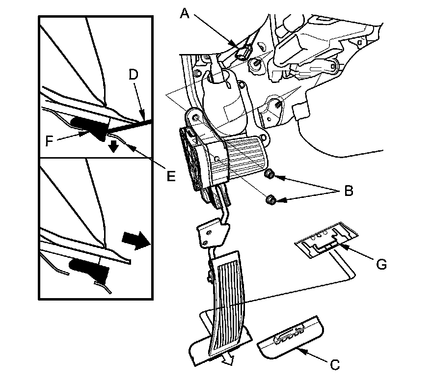 3. Remove the two mounting nuts (B), then remove the clip (C). Using a flat-tip screwdriver (D), push the lock (E), then remove the accelerator pedal pad (F) from the pedal stop (G).