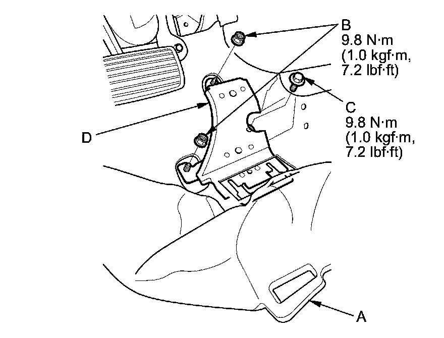 - If the pedal stop is damaged, replace it by pulling back the carpet (A), and removing the nuts (B), the bolt (C), and the pedal stop (D).