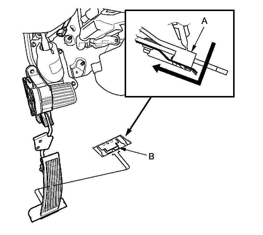 1. Install the accelerator pedal pad (A) to the pedal stop (B). Slide the pad until it locks with a clicking sound.
