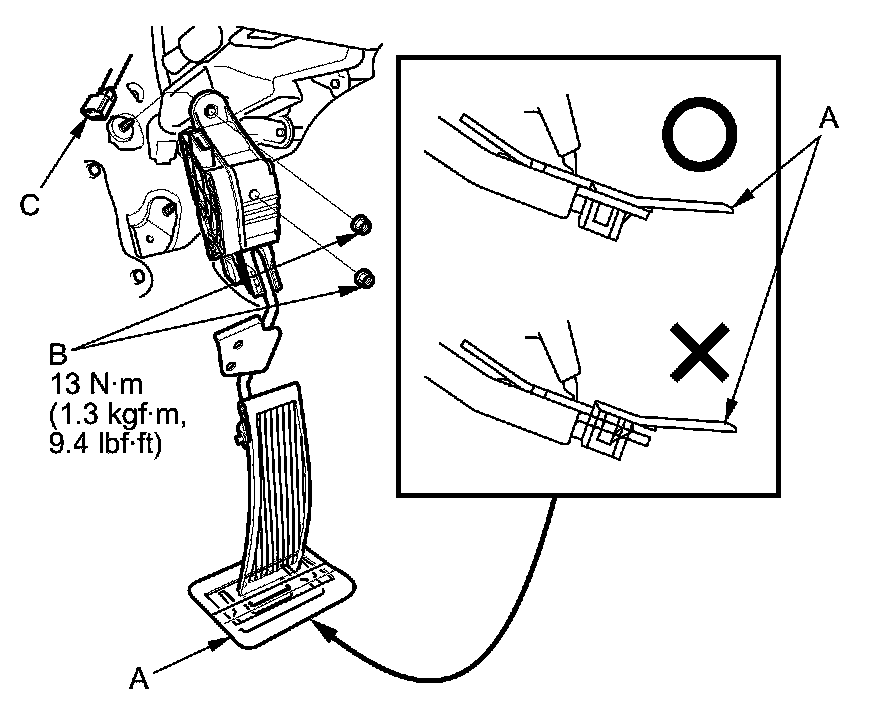 3. Install the nuts (B), and connect the APP sensor 6P connector (C).