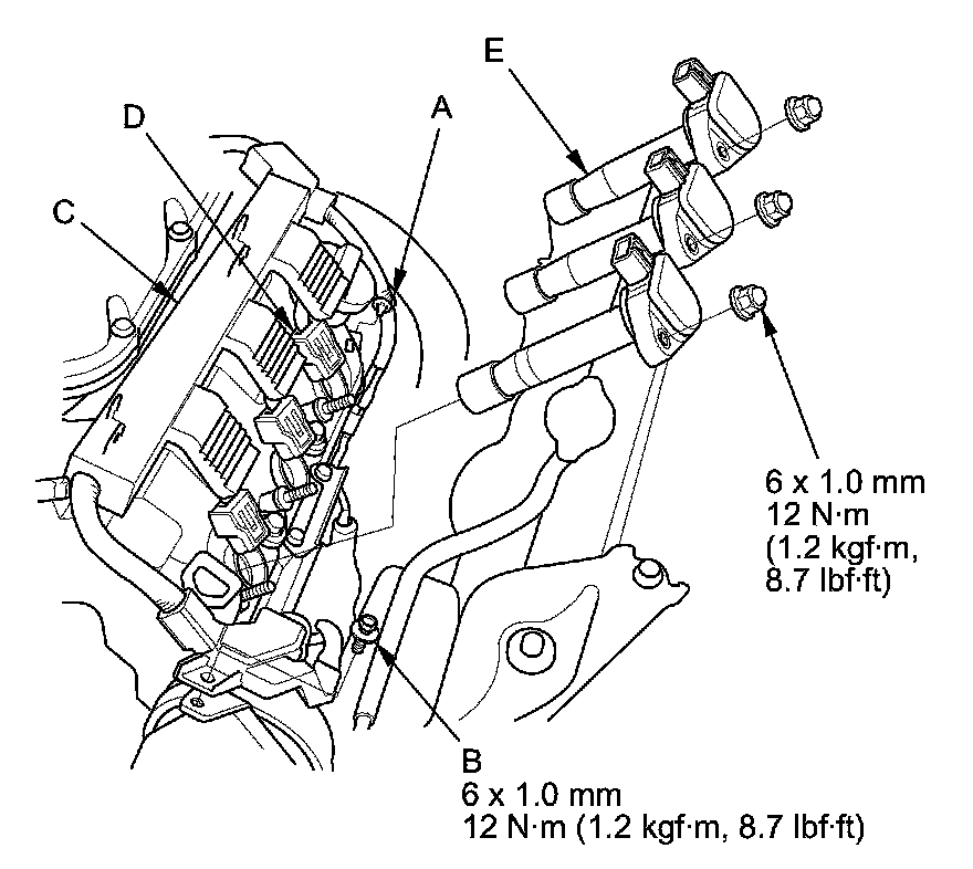 3. Disconnect the ignition coil connectors (D), then remove the front ignition coils (E).