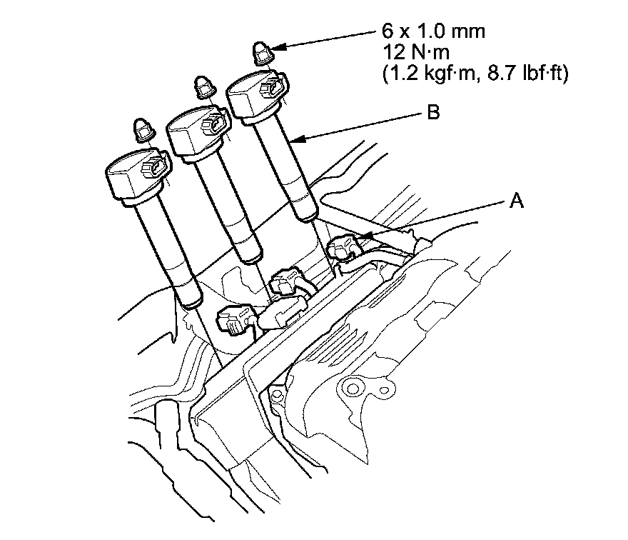 3. Disconnect the ignition coil connectors (A), then remove the rear ignition coils (B).