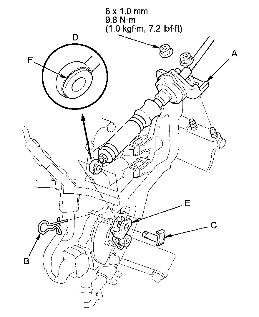 6. Check the bushing (F) in the shift cable end for proper fit and wear. If the bushing is loose or worn, replace the shift cable Service and Repair.