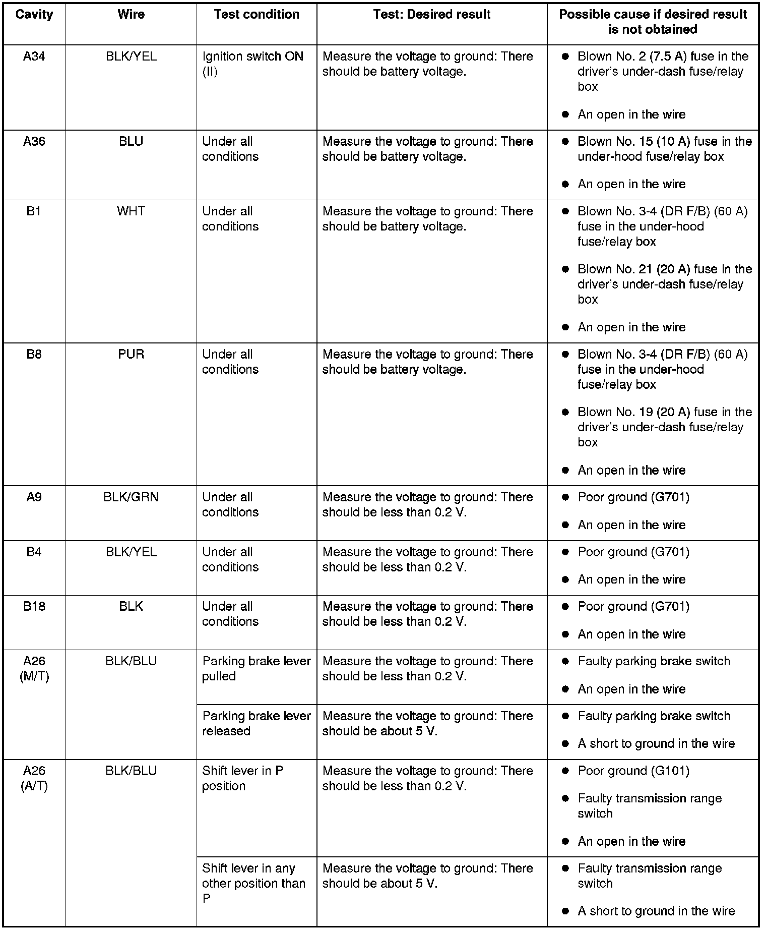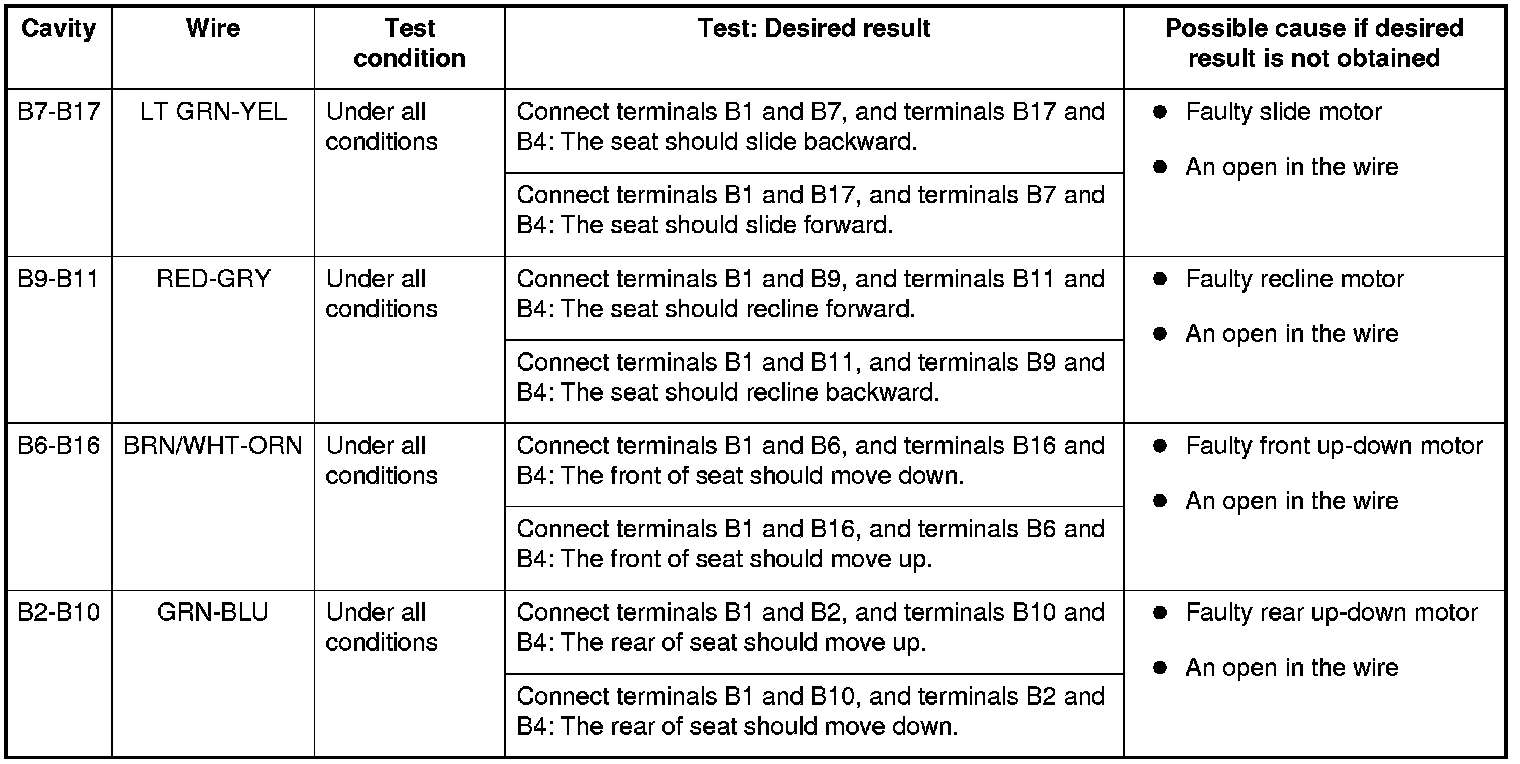 5. Reconnect the connectors to the power seat control unit, and do these input tests at the following connectors.