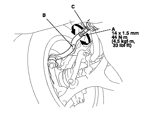 3. Hold the adjusting bolt (A) on the rear control arm (B), and loosen the self-locking nut (C).