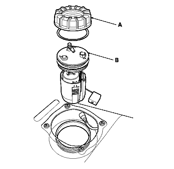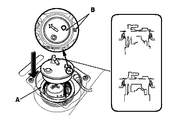 1. Temporarily attach a new base gasket (A) to the fuel tank unit (B), then insert the fuel tank unit partially into the fuel tank.