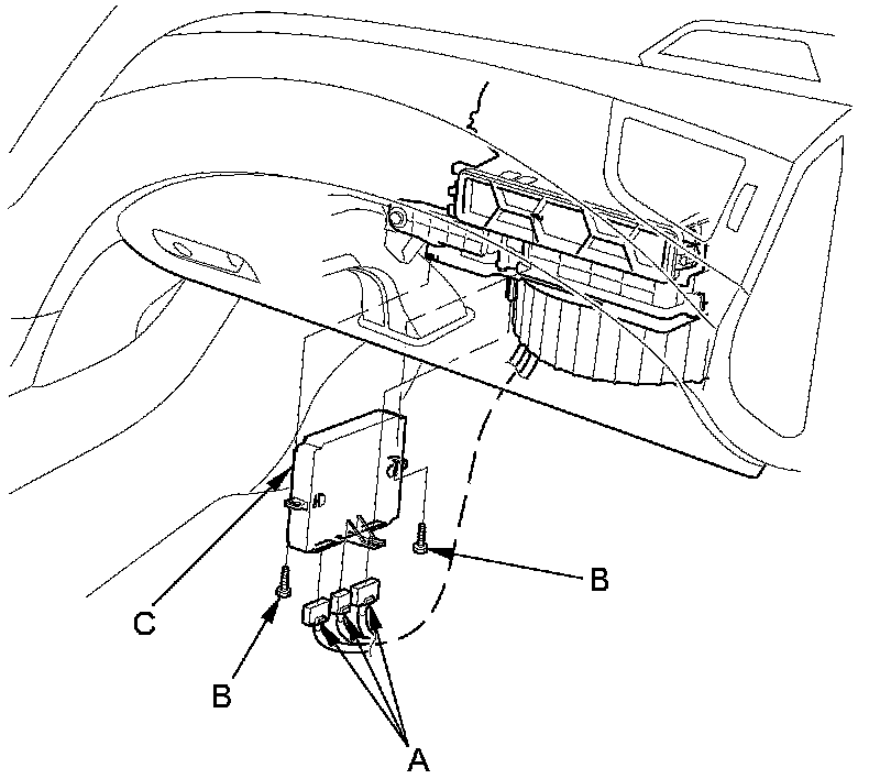 2. Disconnect the connectors (A). Remove the bolts (B) and the climate control unit (C).