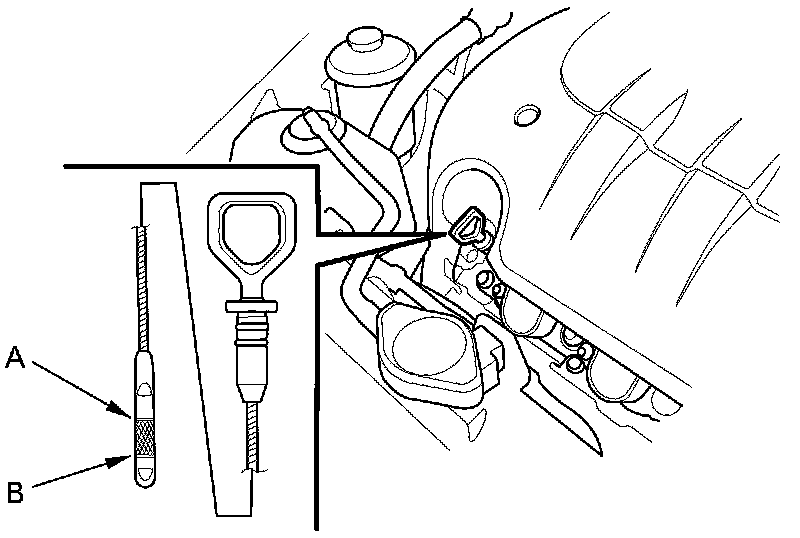 3. Remove the dipstick, and check the engine oil level. It should be between the upper mark (A) and the lower mark (B).