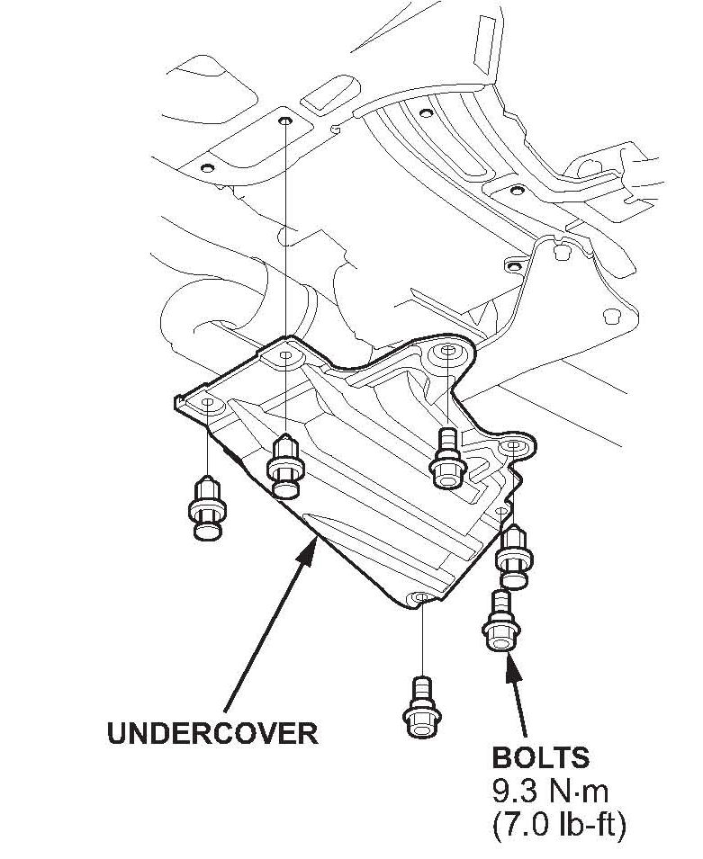 10. Reinstall the engine undercover. Torque the bolts to 9.3 N.m (7 lb-ft), then lower the vehicle.