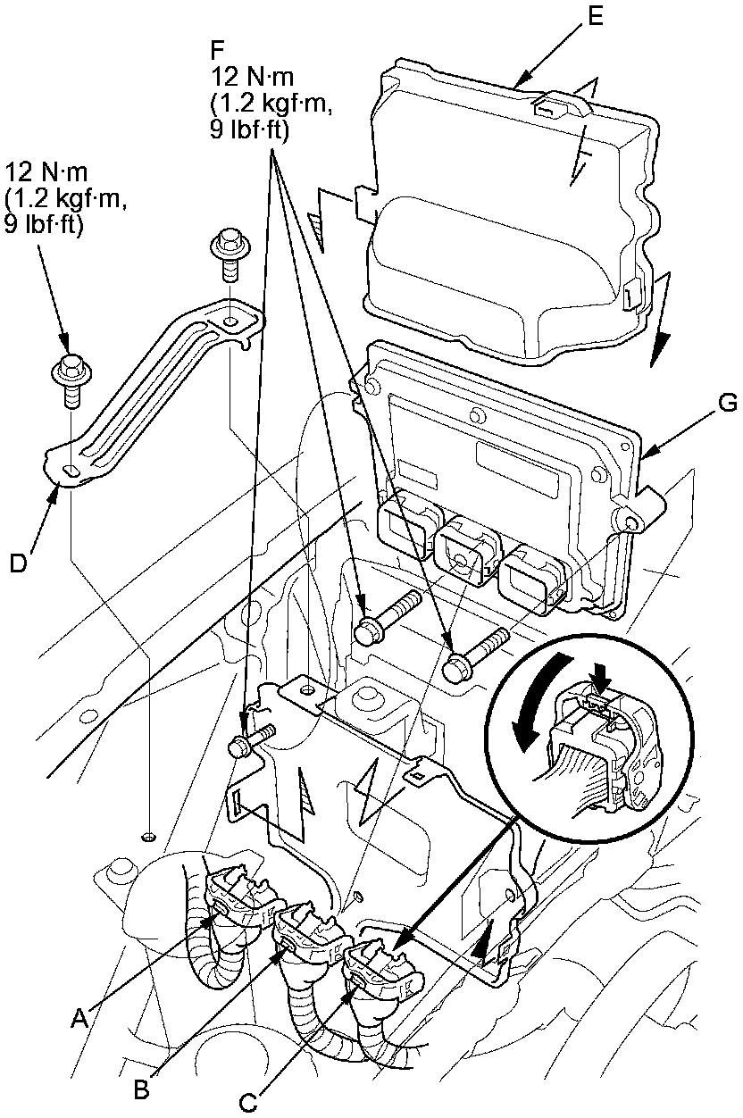 14. Loosen or remove the bolts (F), and remove the PCM (G).