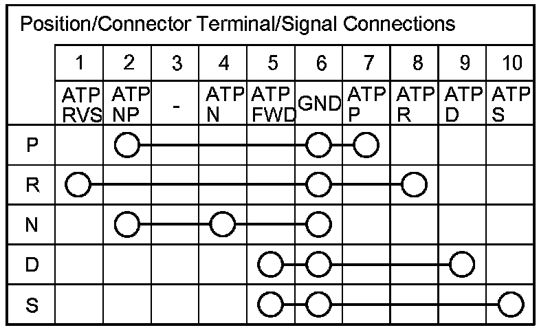 8. Check for continuity between the terminals at the transmission range switch connector. There should be continuity between the terminals in the following table for each transmission range switch position.