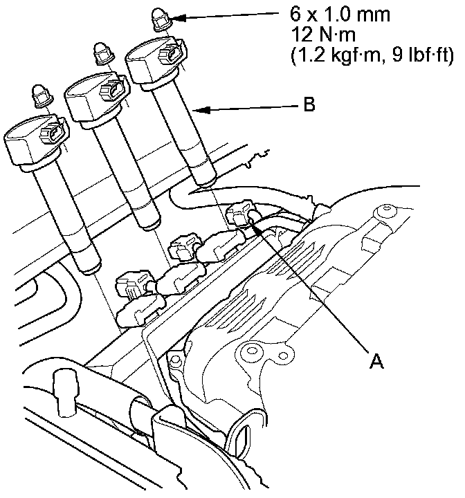 2. Disconnect the ignition coil connectors (A), then remove the rear ignition coils (B).