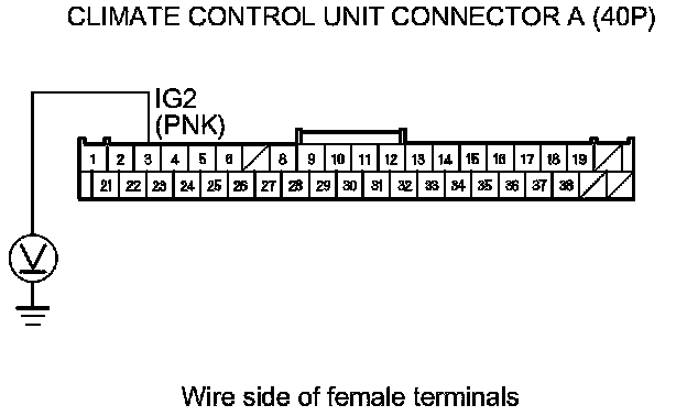 3. Measure the voltage between climate control unit connector A (40P) terminal No. 3 and body ground.
