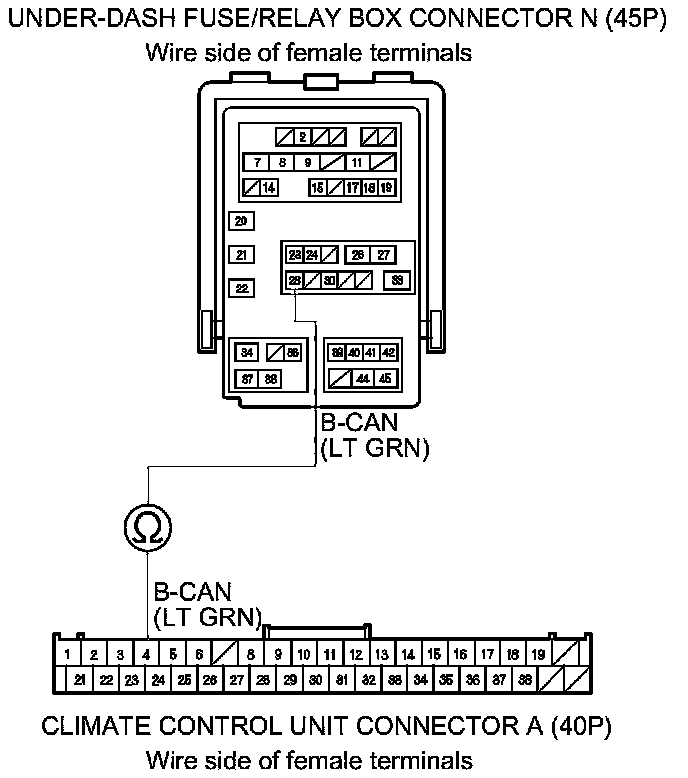 8. Check for continuity between under-dash fuse/relay box connector N (45P) terminal No. 28 and climate control unit connector A (40P) terminal No. 4.