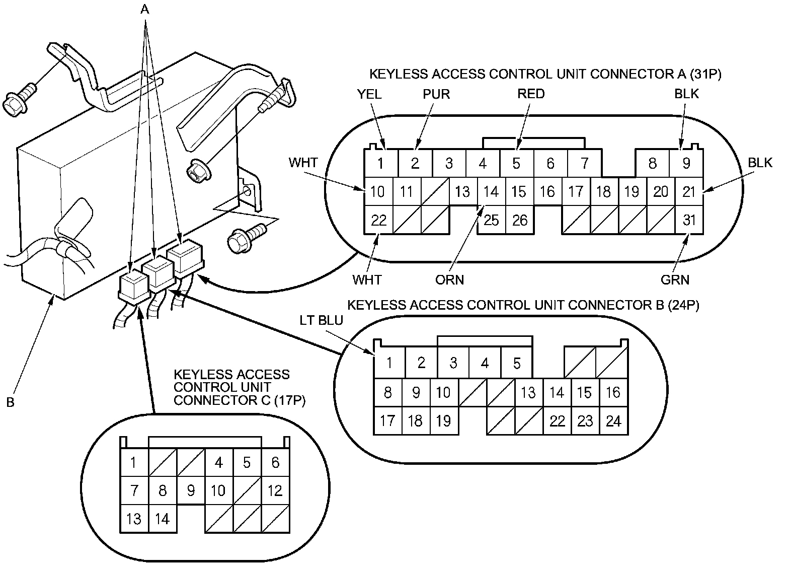 3. Disconnect the connectors (A) from the keyless access control unit (B).