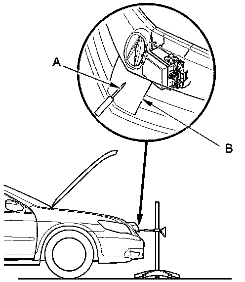 5. Adjust the tip of the height rod (A) on the target to the center of the front radar cover (B).