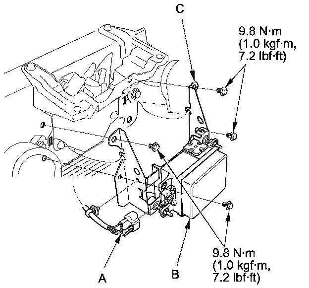 4. Loosen the aiming bolts (A) a little at a time, and remove the millimeter wave radar (B) from the main bracket (C).