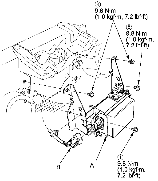 8. Install the millimeter wave radar (A), then tighten the bolts in the numbered sequence shown.