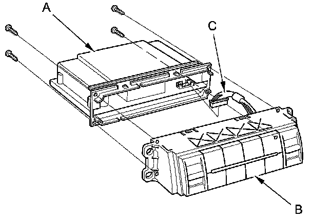 4. Remove the self-tapping screws, then carefully separate the climate control unit (A) from the climate control panel (B). Disconnect the connector (C) from the climate control unit. Do not kink or pull on the wires between the control panel and the control unit. Do not touch the electronic components on the printed circuit board in the control unit and the control panel.
