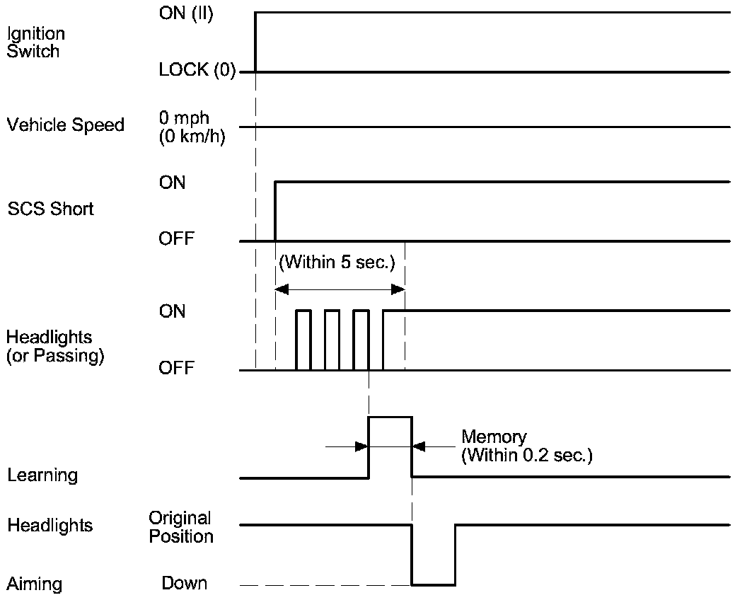 9. Within 5 seconds, turn the headlights (low beam) or passing switch ON and OFF three times repeatedly, and leave them on.