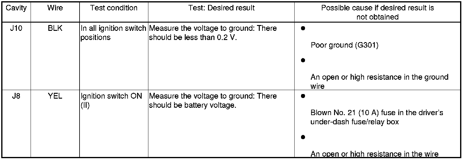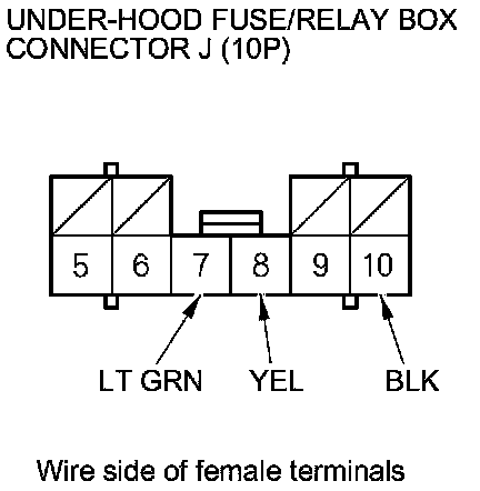 5. Disconnect under-hood fuse/relay box connector J (10P), and do the following input tests.