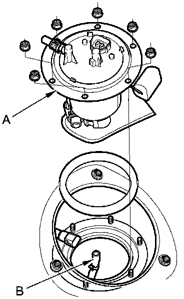 2. Install the fuel tank unit (B) in the reverse order of removal with a new base gasket (C).