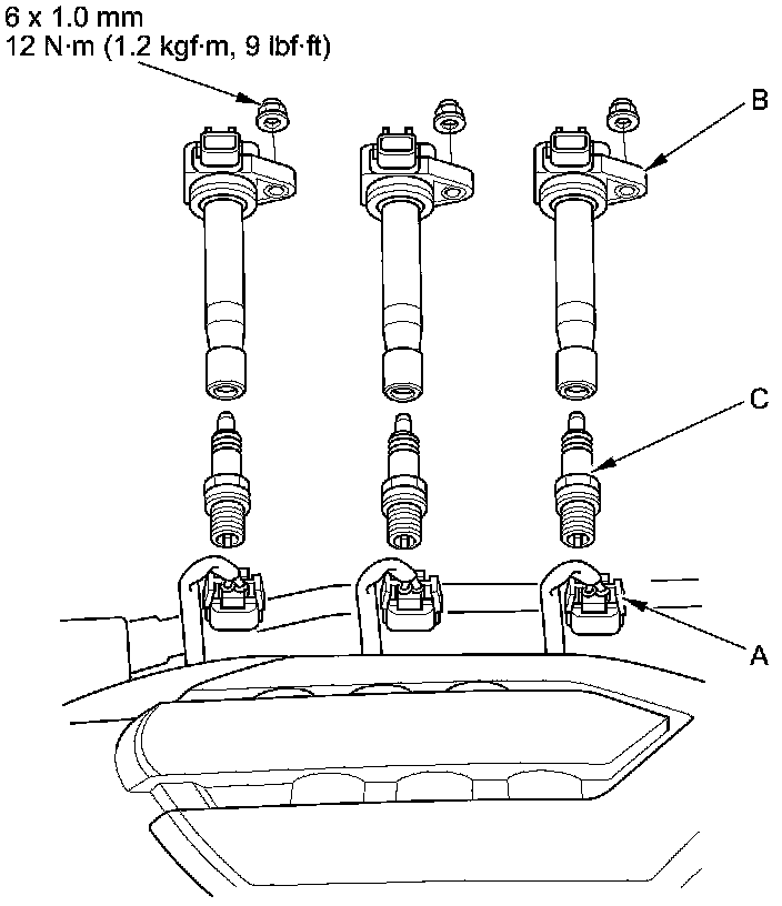 4. Disconnect the ignition coil connectors (A), then remove the front ignition coils (B).