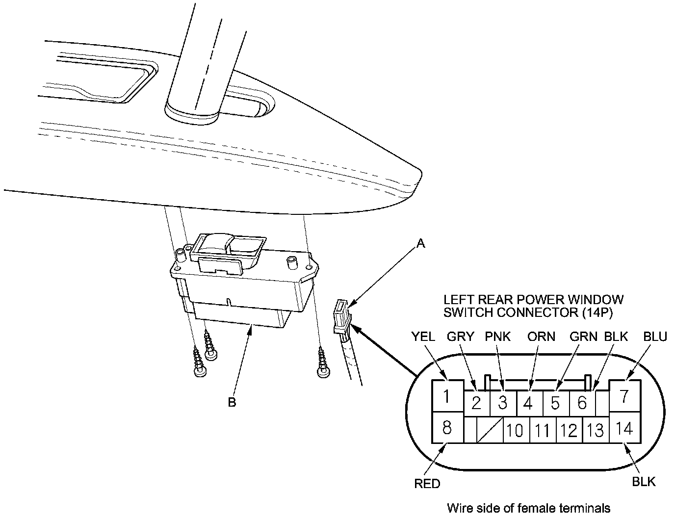 3. Disconnect the 14P connector (A) from the left rear power window switch (B).