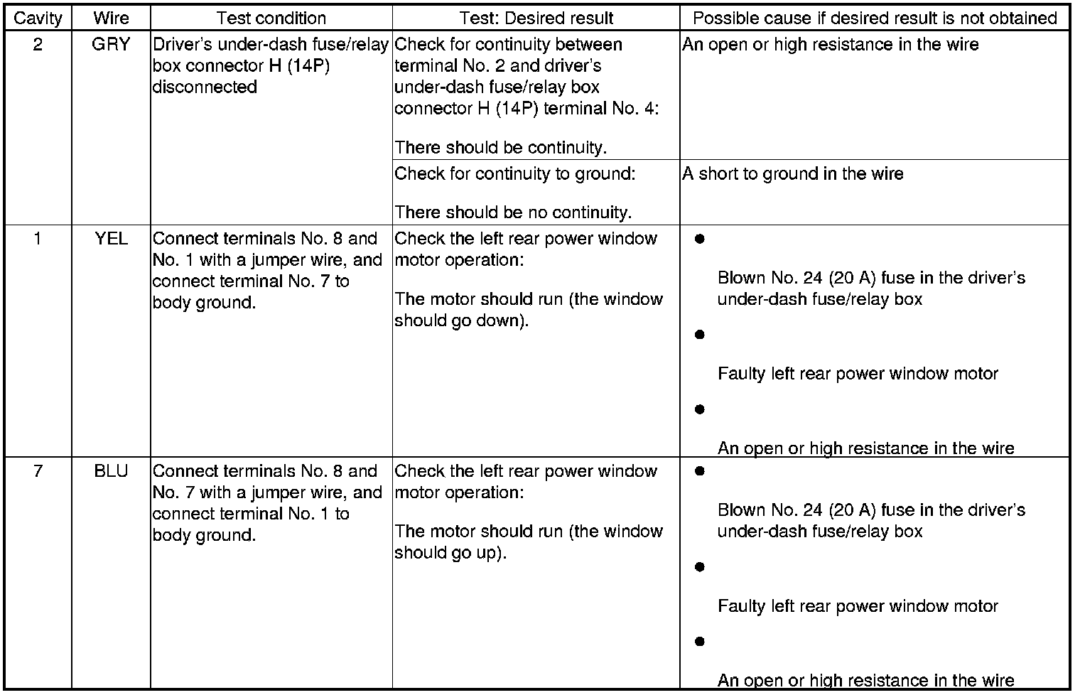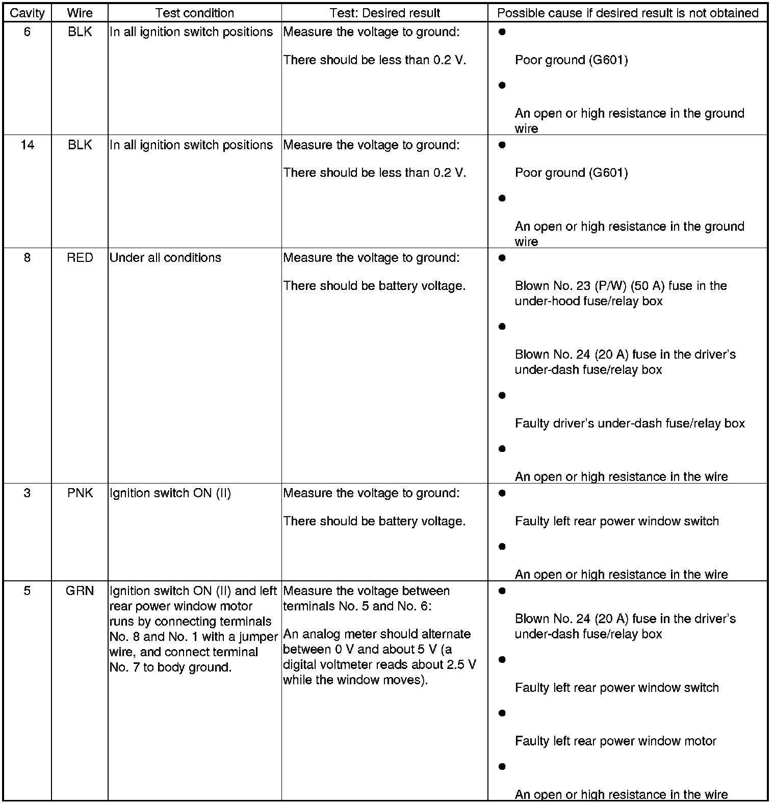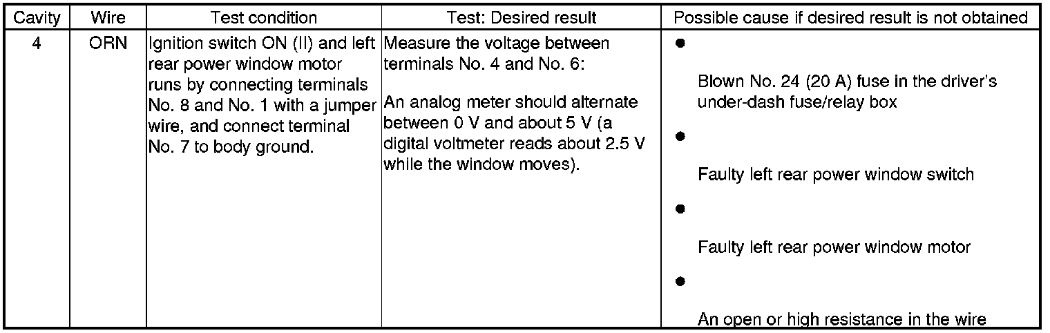 - If all the input tests prove OK, the left rear power window switch must be faulty; replace it Passenger's Power Window Switch Test/Replacement and go to step 7.