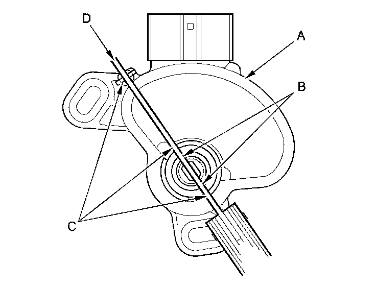 7. Set a new transmission range switch (A) to the N position. Align the cutouts (B) on the rotary-frame with the neutral positioning cutouts (C) on the transmission range switch, then put a 2.0 mm (0.08 in) feeler gauge blade (D) in the cutouts to hold the transmission range switch in the N position.