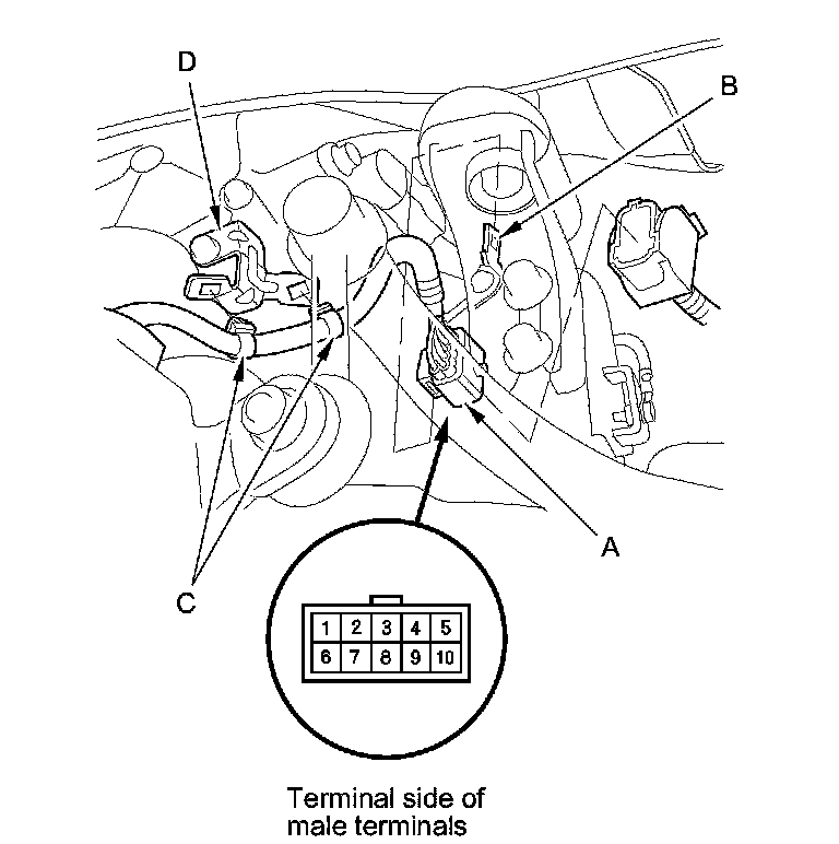 4. Remove the harness clamps (C) from the clamp bracket (D).