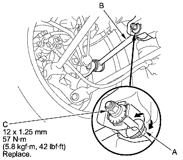 3. Hold the adjusting bolt (A) on the rear control arm (B), and loosen the self-locking nut (C).