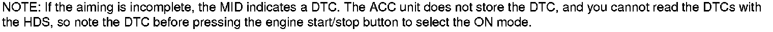 NOTE: The result of all auto aiming can be confirmed by the HDS, or by watching the MID. When watching the MID, if the auto aiming is confirmed, the MID will display "RADAR OK" with the specification of 100ᤣ2, and the brake lights will illuminate. When the target is out of auto range, the MID will display "NO TARGET", the brakes will not illuminate, and an audible tone will sound. The auto aiming is not complete. If DTC 120, 121, 122, 123, or 124 is indicated, the aiming target is not set correctly. Inspect the millimeter wave radar mounting for bent or damaged parts. Verify the vertical aiming. Reset the aiming target.