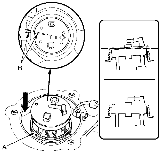 3. Align the marks (B) on the fuel tank and the fuel tank unit, then insert the fuel tank unit into the fuel tank until it sits on the base gasket.