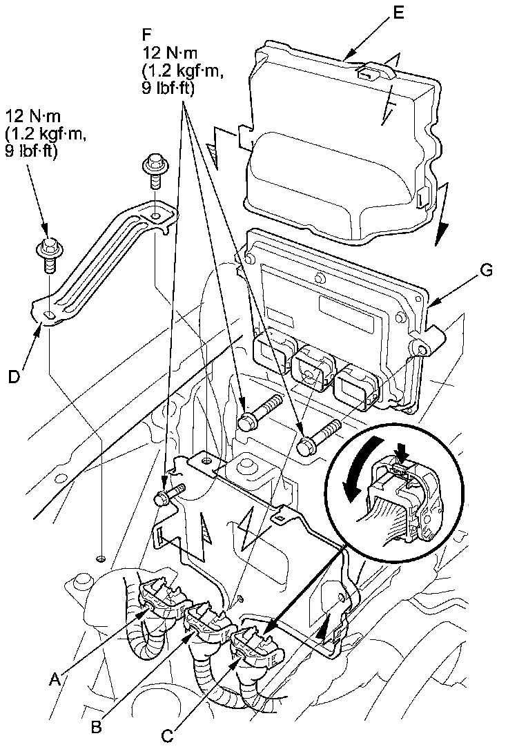 14. Loosen or remove the bolts (F), and remove the PCM (G).