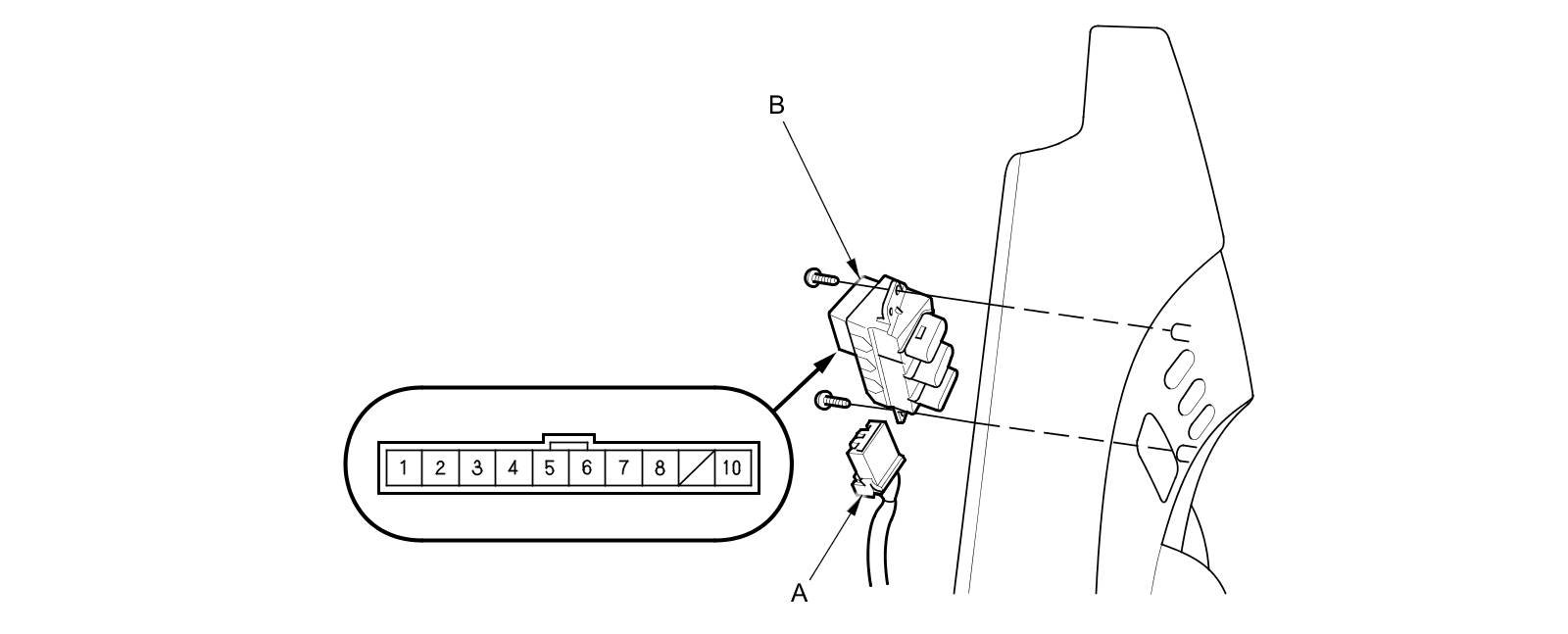 2. Disconnect the 10P connector (A) from the driving position memory switch (B).