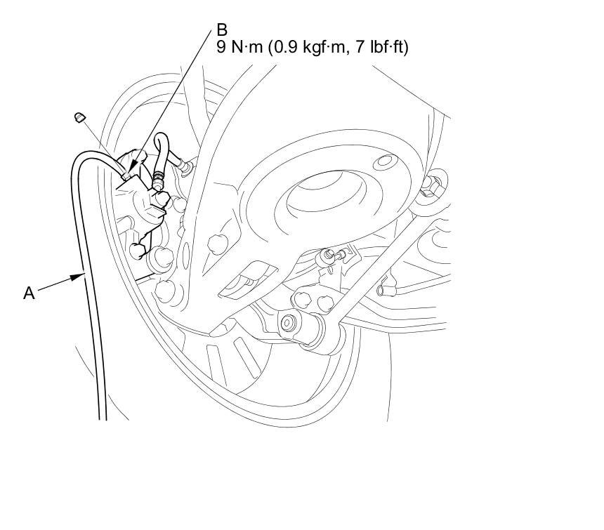 4. Attach a length of clear drain tube (A) to the bleed screw (B), then loosen the bleed screw to allow air to escape from the system. Then tighten the bleed screw securely.
