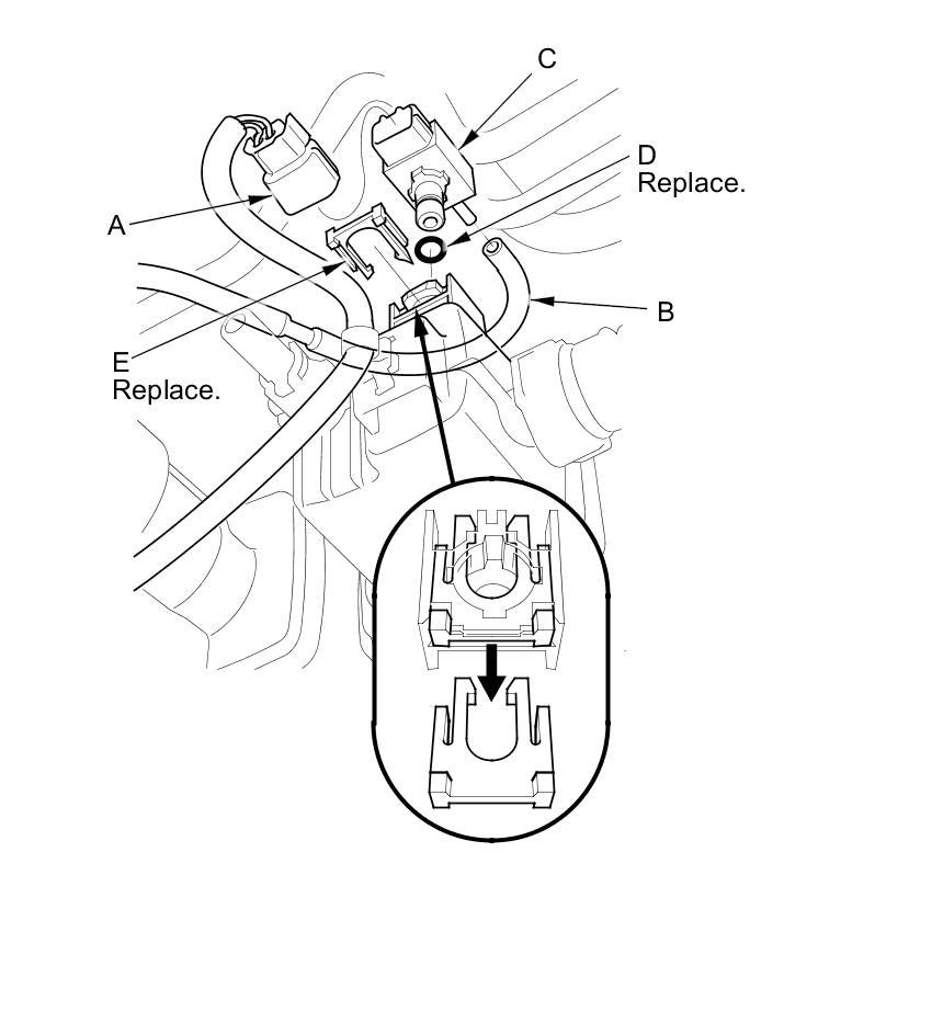 5. Install the parts in the reverse order of removal with a new O-ring (D) and a new retainer (E).