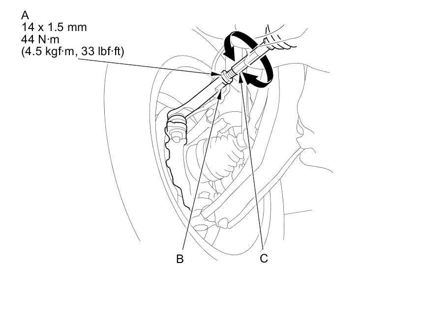 3. Loosen the tie-rod end locknuts (A) while holding the flat surface sections (B) of the tie-rod end with a wrench, and turn both tie-rods (C) until the front toe is within specifications.
