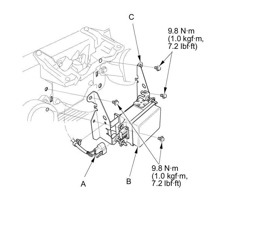4. Loosen the aiming bolts (A) a little at a time, and remove the millimeter wave radar (B) from the main bracket (C).
