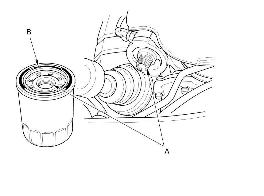 3. Inspect the threads (A) and the rubber seal (B) on the new filter. Clean the seat on the engine block, then apply a light coat of new engine oil to the oil filter rubber seal. Use only filters with a built-in bypass system.