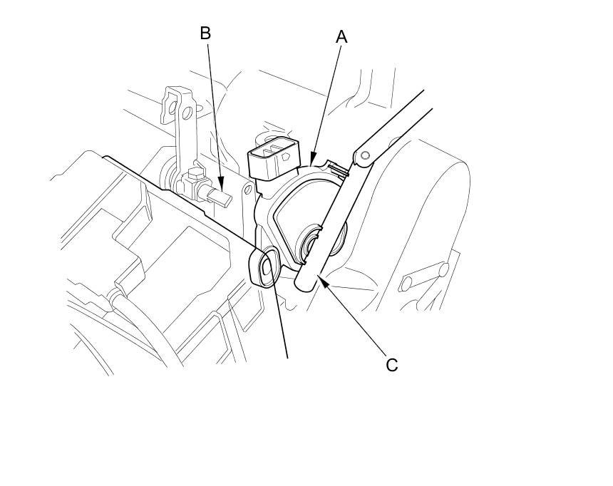 9. Set a new transmission range switch (A) to the N position. Align the cutouts (B) on the rotary-frame with the neutral positioning cutouts (C) on the transmission range switch, then put a 2.0 mm (0.08 in) feeler gauge blade (D) in the cutouts to hold the transmission range switch in the N position.