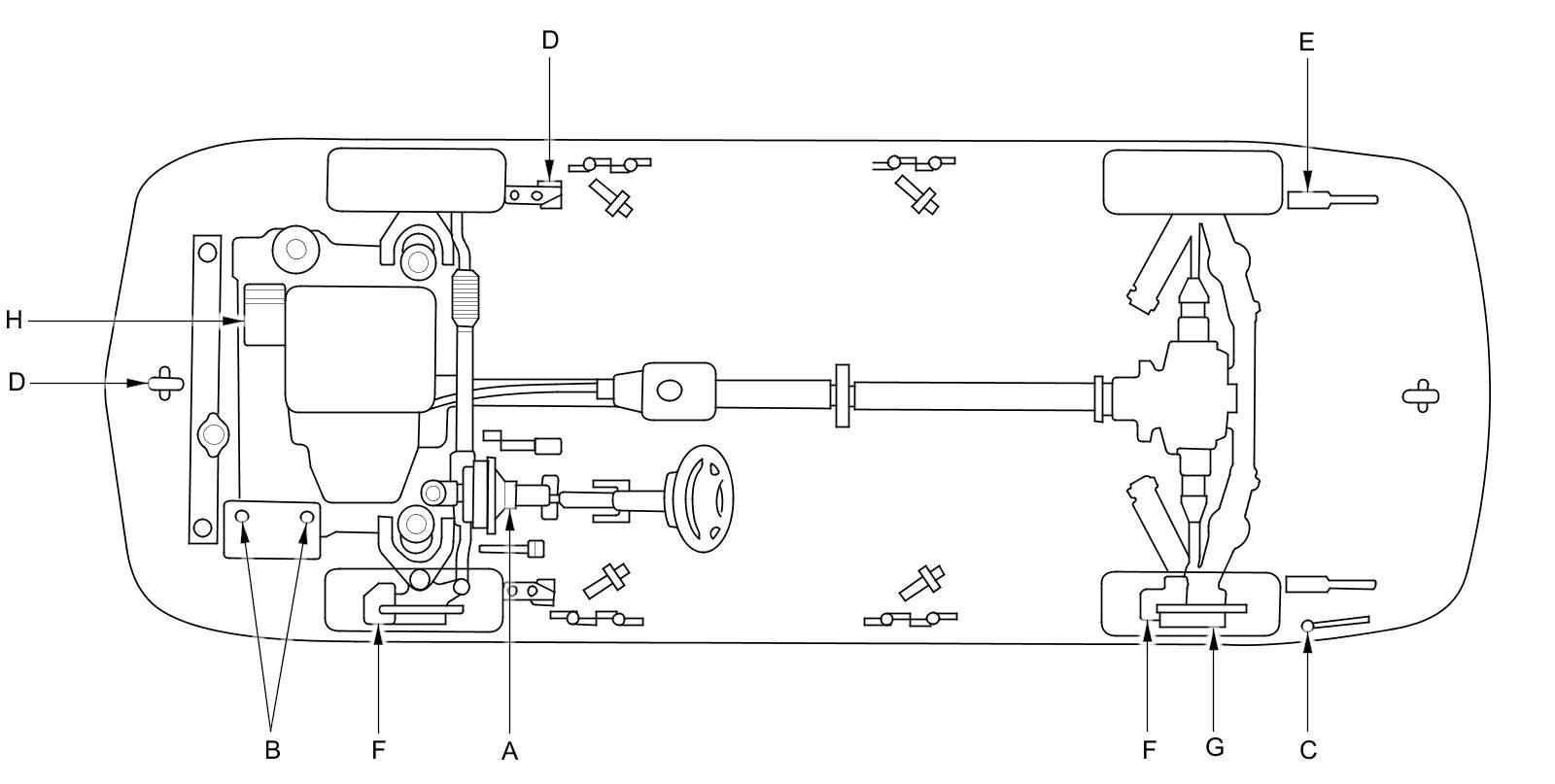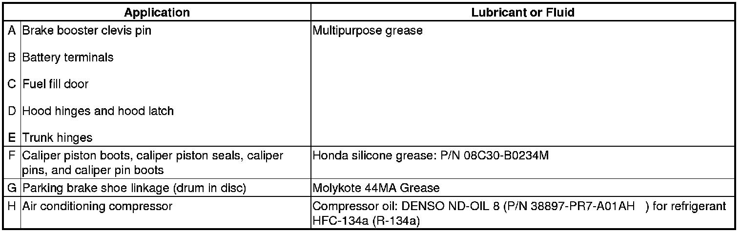 - Lubricate the following areas using the recommended lubricants and fluids.