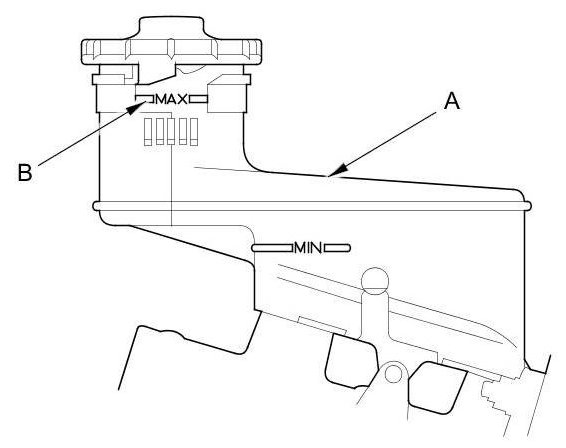 1. Make sure the brake fluid level in the reservoir (A) is at the MAX (upper) level line (B).